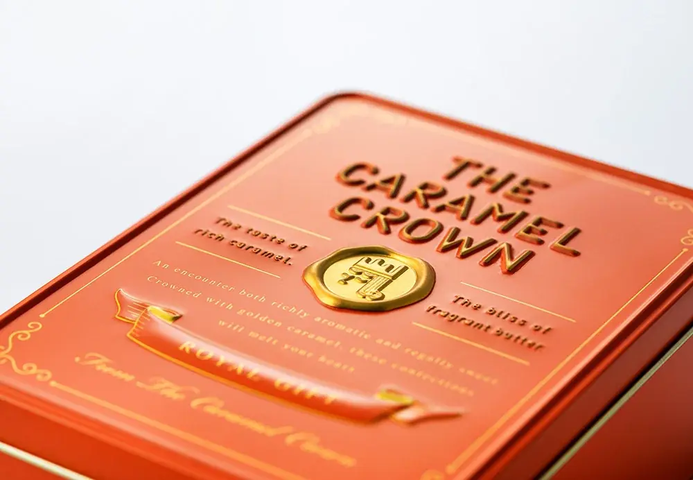 | デザイン | オレンジ基調の缶、エンボス加工、ゴールドロゴ、チョコ色リボン/テーマ「キャラメル王室からの贈り物」 |