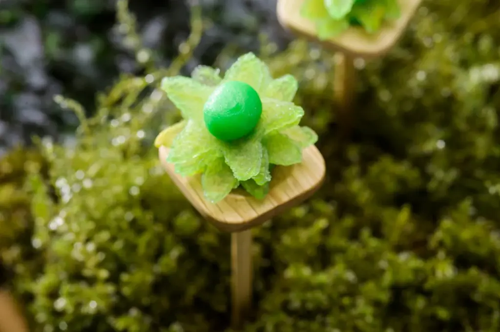 - ジャゴケ:時間とともに形が変わる傘状の胞子体をドライフルーツとチョコレートで表現。