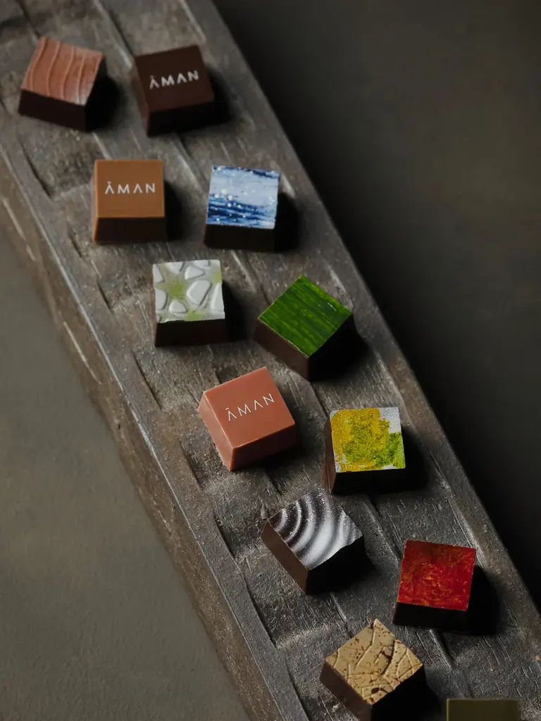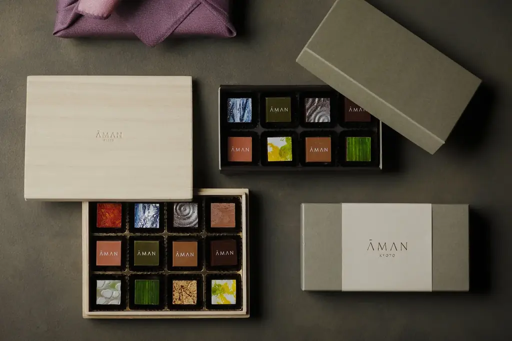 本作はエグゼクティブペストリーシェフ・松尾浩幸によるオリジナル作品で、貴船の川床や嵐山の竹林、禅寺の枯山水、アマン京都の庭の石畳や北山杉、落ち葉といった京都の四季折々の情景をモチーフにした一粒ずつ異なるショコラを詰め合わせています。素材には上賀茂のバジル、城陽の無花果、丹波の栗や黒豆、宇治の有機抹茶など、京都産の選りすぐりの食材を用い、自然を尊重するアマンの世界観を表現しています。
