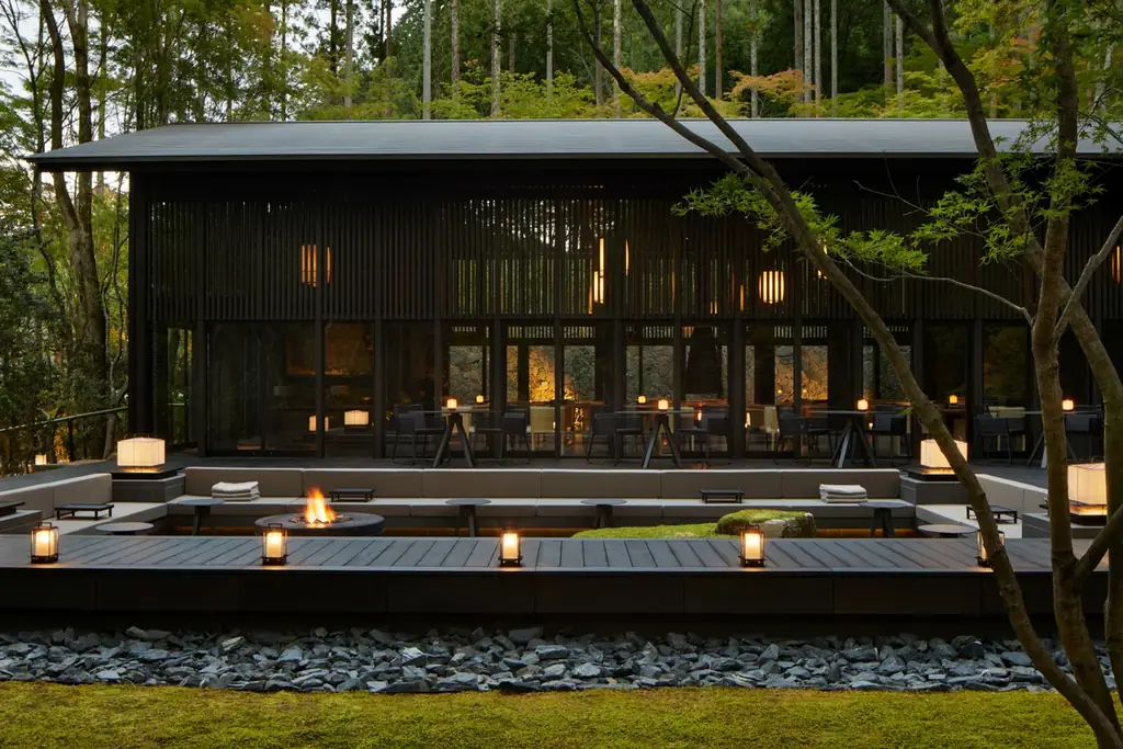 アマン京都は京都市北部、左大文字山から続く鷹峯三山の麓に位置するリゾートです。約2万4千平方メートルの広大な敷地に、アライバル棟、リビング棟(オールデイダイニング)、レストラン棟(日本料理)、天然温泉を備えるスパ棟、宿泊棟、茶室が点在し、森の庭と一体となった設計がなされています。