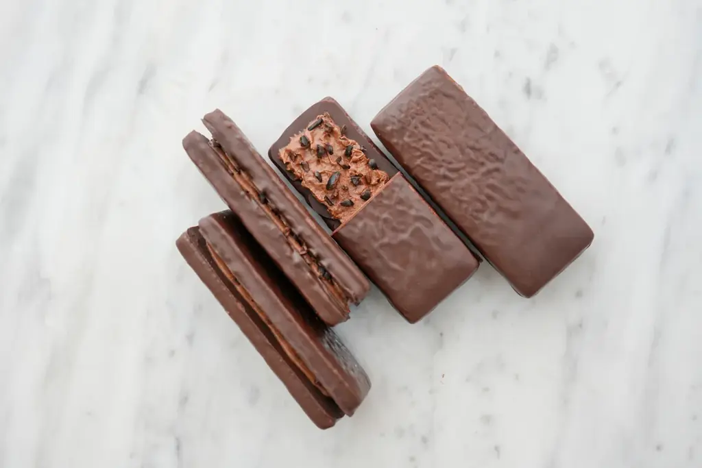 - サブレサンドショコラ(ショコラ):エクアドル産カカオ豆100%のカカオマスを使ったチョコレートでコーティングしたバターサブレ。チョコレートクリームとカカオニブをサンドした季節限定商品。価格:2個入 692円(税込)/5個入 1,728円(税込)
