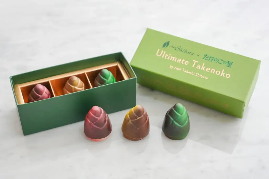 - Ultimate Takenoko(アルティメットタケノコ):明治「たけのこの里」をモチーフに柴田武シェフが創作した数量限定のボンボンショコラ。ドミニカ共和国産カカオの「苺スパイス」、メキシコ産ホワイトカカオの「ショコラノワール」、ベネズエラ産カカオの「ソルテド抹茶」という3種を詰め合わせた商品です。価格:2,592円(税込).
