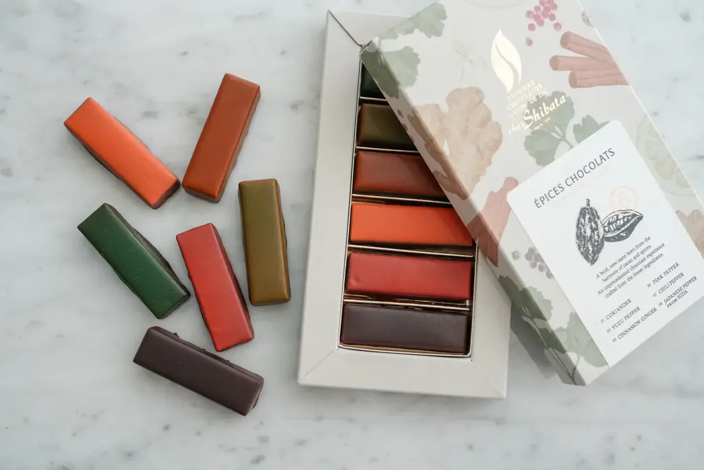 - エピスショコラ:コートジボワール産の厳選チョコレートを使用した、スパイスの香りと味わいをテーマにしたショコラ詰合せ。6種のフレーバーはコリアンダー、柚子胡椒、シナモンジンジャー、ピンクペッパー、七味唐辛子、飛騨山椒。価格:3,186円(税込)
