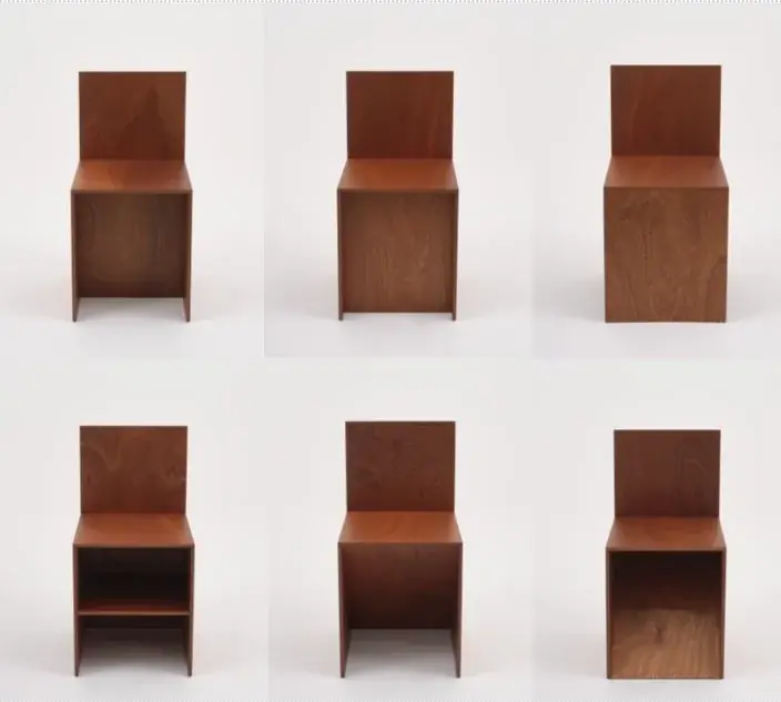 家具は、ジャッドがニューヨークおよびテキサス州マーファの自身の空間を整えるために設計したベッド、椅子、棚、テーブルなどを中心に紹介されます。素材は主に木材(合板含む)、薄版金属、およびこれらに基づくカテゴリーに分けて展示されています。