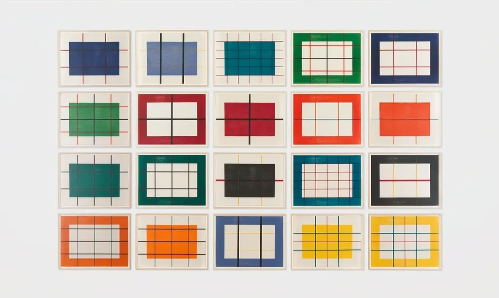 初期の版画では一色または二色刷りが用いられることが多く、後期には木版による多色刷りを採用するようになりました。最大のセットは20点組の木版で構成されており、作品群を通じてジャッドの比率と色彩への一貫した関心が追跡できます。