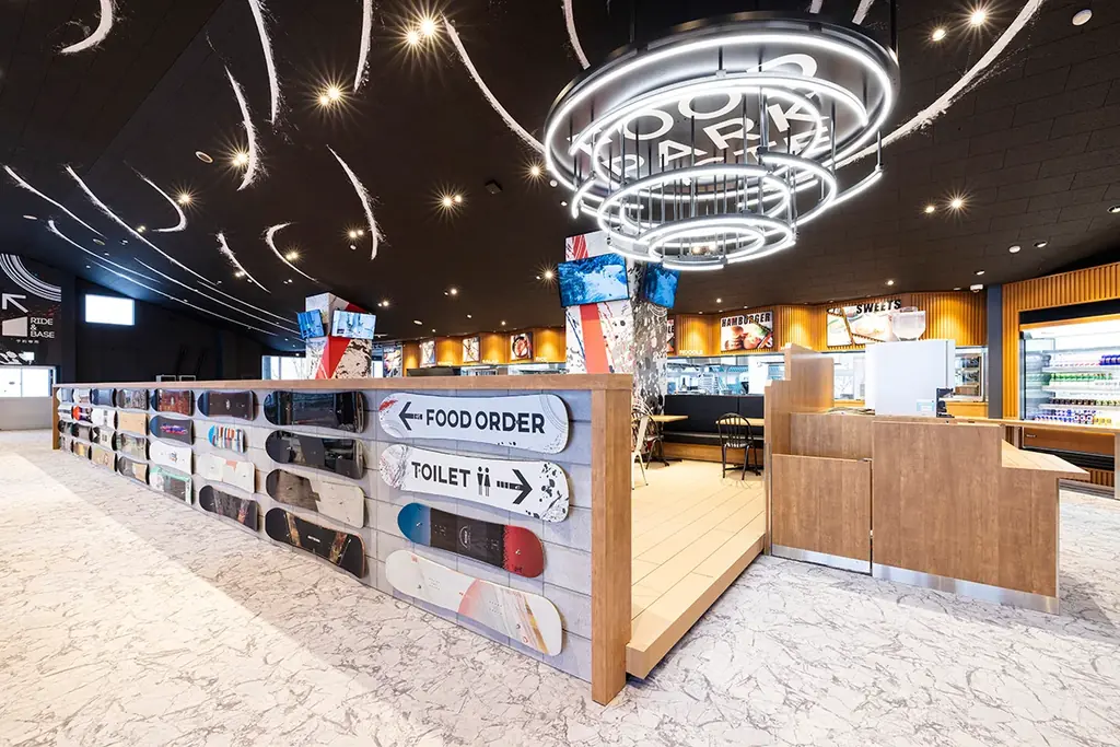 センターハウス内の最新レストラン「フードパークピステ」やファミリー向けのフードコートには世界と日本の料理を合わせて約80種類のメニューを用意しています。今シーズンは新メニューとして「ナンと2種類のカレー」「チーズたっぷりカルボナーラ」「炭火焼 鶏ハラミ丼」「チキンバケットサンド」「ダブルベリーケーキ」「パイン&マンゴーケーキ」などが追加されました。