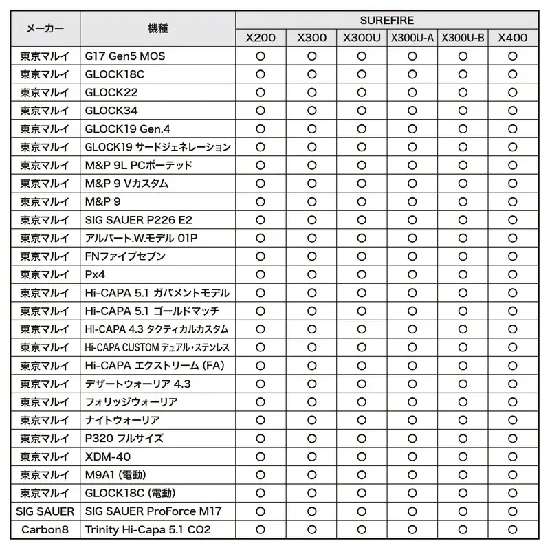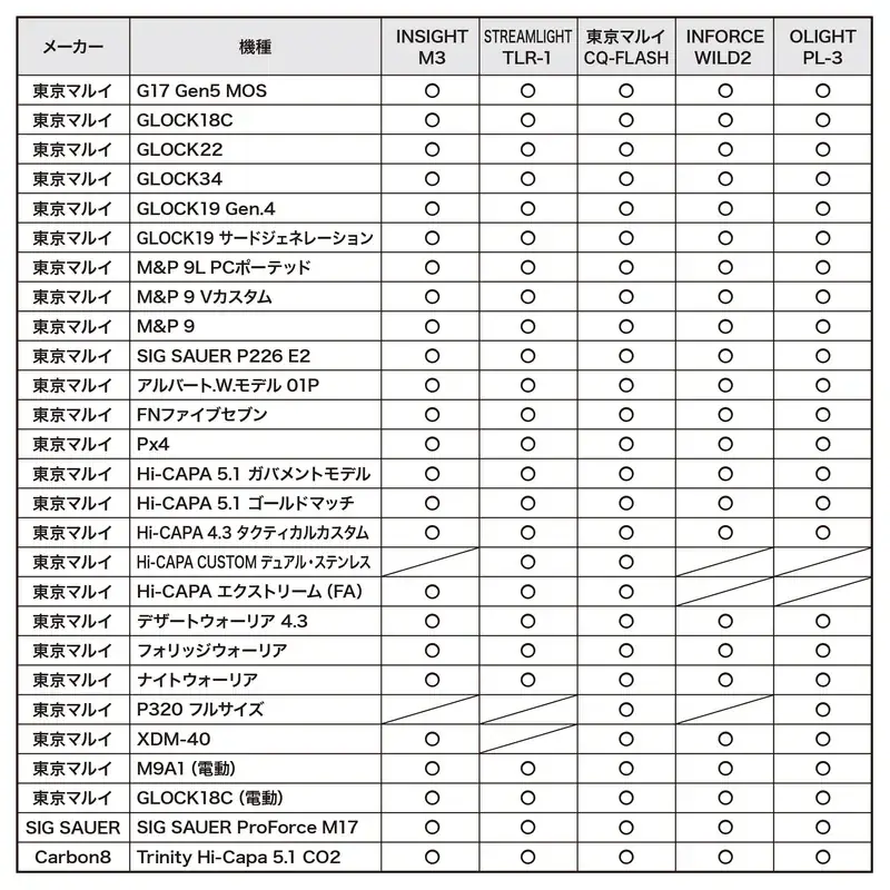 | 対応ライト例 | SUREFIRE X300シリーズ、STREAMLIGHT TLR-1、OLIGHT PL-3 |