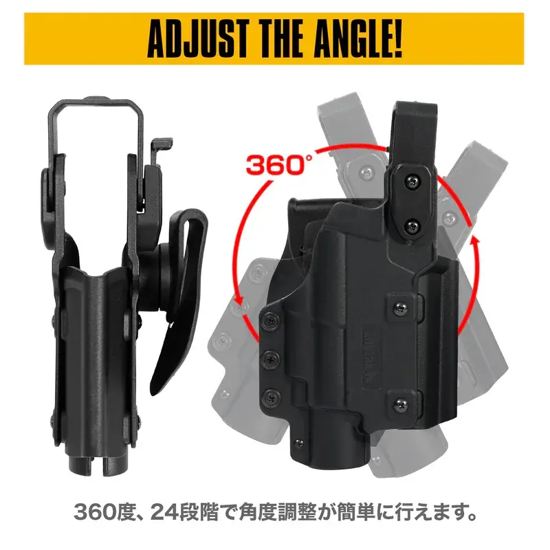 調整ネジ構造により、ハンドガン本体とライトの組み合わせに柔軟に対応する。ホルスターはライト形状を基準にフィッティングするため、グロック、ハイキャパ、M&P、SIG系など多様なハンドガンを安定して保持できるという。