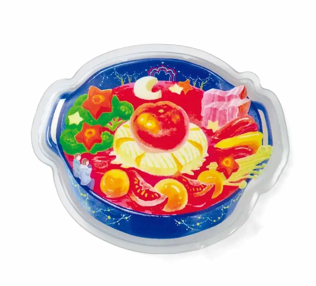 - イルミネーションを連想させる華やかなデザインで、中心に輝く完熟トマトやにんじんのお星さま、大根で作られた月を模したモチーフが配置されています。鍋の具材たちが光のショーを繰り広げる様子が描かれています。
