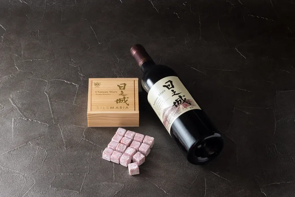 原材料・由来:山梨県韮崎市穂坂町の「マルス穂坂ワイナリー」で造られた長期熟成型プレミアム赤ワイン『穂坂日之城 カベルネ&メルロー 遅摘み』を使用。果実香と樽由来の深い風味がホワイトとルビーチョコに溶け合い、豊かな余韻をもたらす配合です。