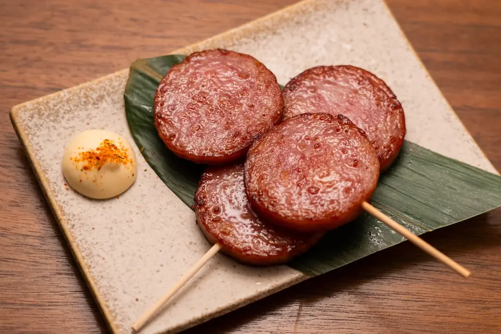 雲仙ハム串焼き(2本)は、長崎県民に親しまれてきた雲仙ハムを串焼きにしたメニューで、価格は890円(税込)です。屋台感覚で楽しめる一品として提供されます。