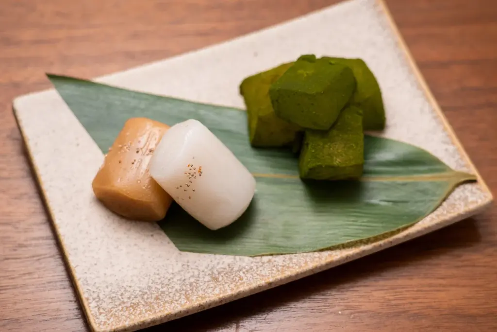 ごぼう餅と抹茶わらび餅の盛り合わせは、平戸藩主・松浦家にゆかりのある甘味を含みます。平戸銘菓「ごぼう餅」は松浦家で創設された武家茶道「鎮信流(ちんしんりゅう)」の茶菓子として重用されてきた歴史があり、鹿児島・知覧の抹茶を使ったわらび餅と合わせて提供されます。価格は800円(税込)です。