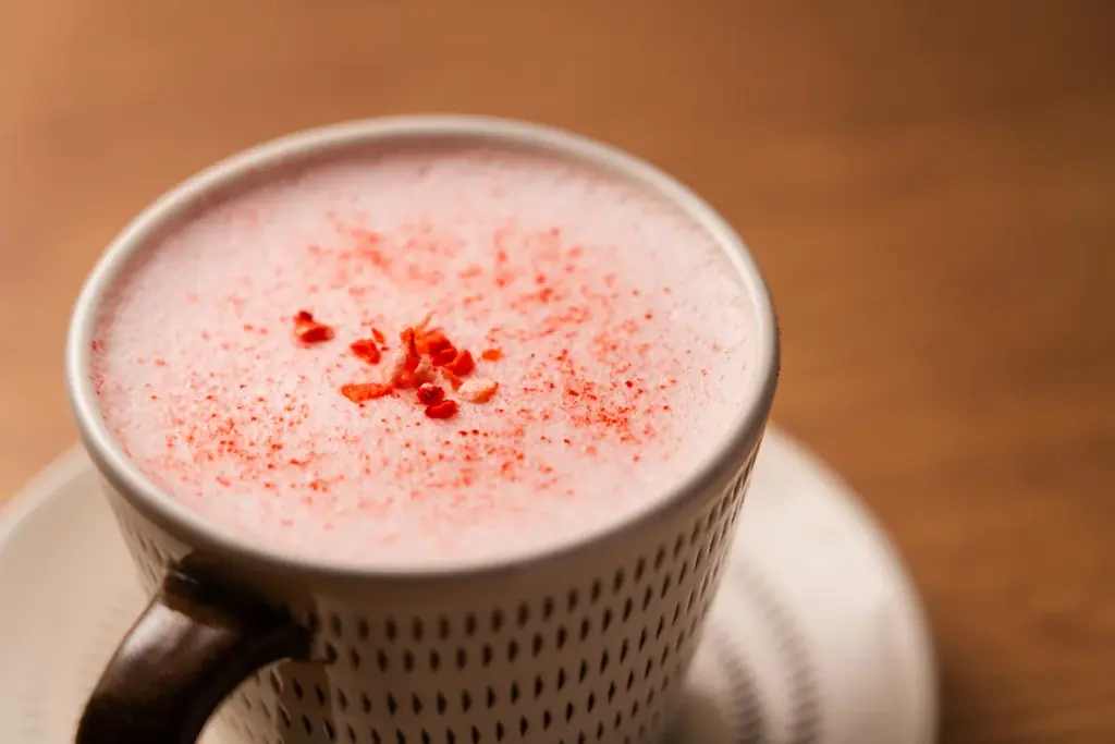 「ストロベリーカフェモカ」はカフェモカに福岡県産あまおうの苺パウダーを合わせた冬向けのドリンクで、チョコレートのコクとあまおうの香りの調和を意識した一杯です。価格は830円(税込)です。