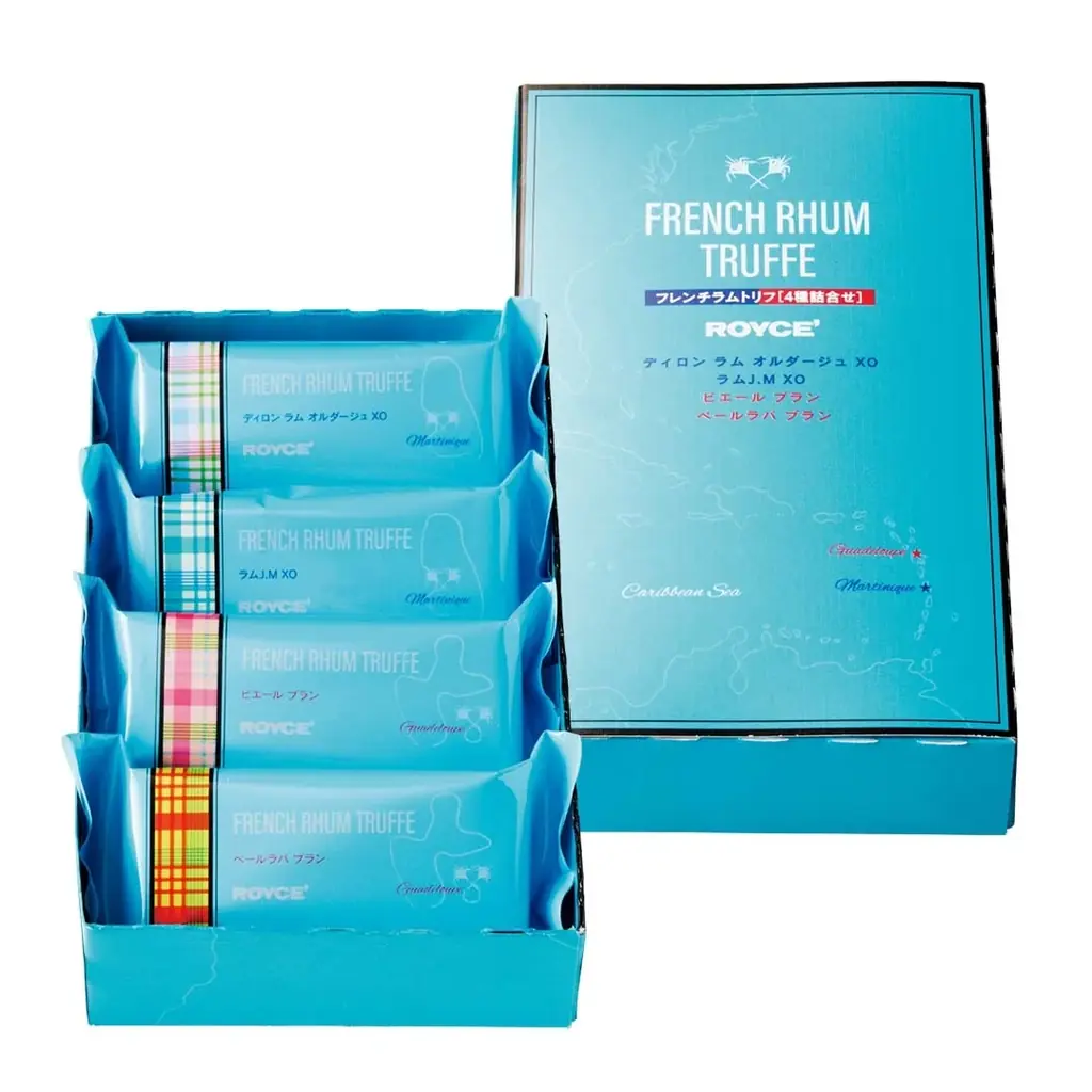フレンチラムを用いた4種のトリフ詰め合わせです。使用するフレンチラムは以下の4銘柄で、各トリフはラム以外のレシピを共通化し、ラム酒の個性が際立つように設計されています。