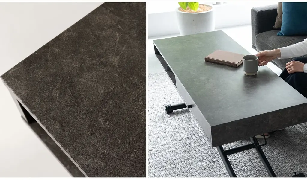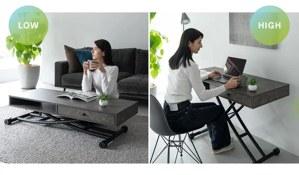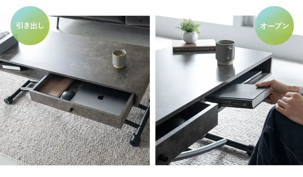 Altiraは昇降機能に加えて、天板下に引き出しとオープン収納を備えた点が特徴です。リモコンや雑誌、小物類を視界から隠しながらも手元に置ける設計により、天板をすっきり保ちたいというニーズに応えます。生活感を抑えたリビング作りをサポートすることを意図しています。