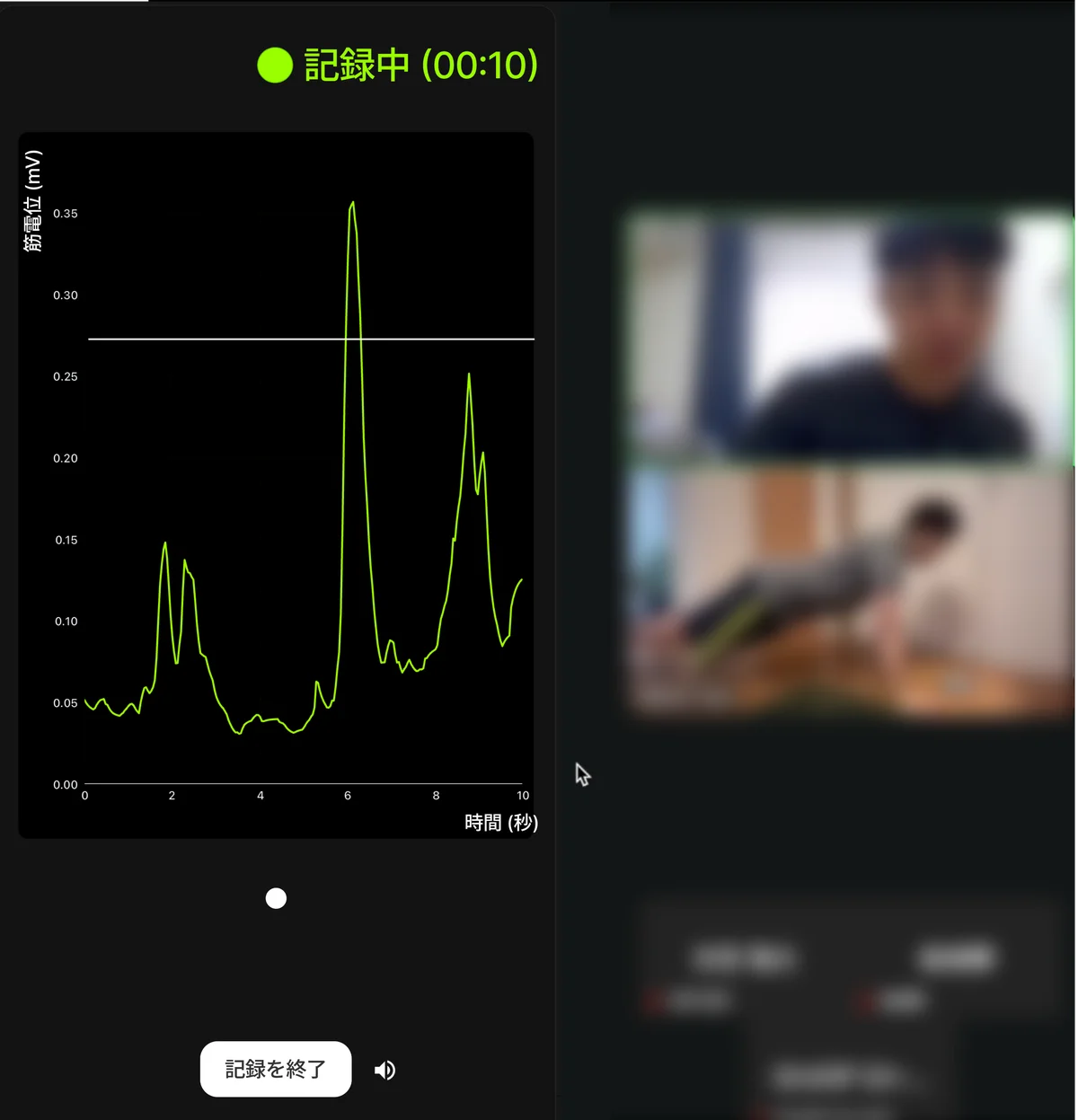 会員はセンサを装着してトレーニングを行い、アプリ上で筋収縮を波形と音で確認できます。視覚と聴覚の両面からフィードバックされることで、プロのトレーナーでも肉眼では見抜けない小さな筋反応を捉えられます。