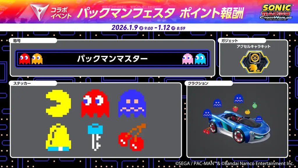 株式会社セガは、2026年1月8日(木)に『ソニックレーシング クロスワールド』の有償ダウンロードコンテンツ(DLC)第3弾として『パックマン パック』の配信を開始しました。DLC配信の日時は本リリースで告知されている通り2026年1月8日で、導入にはゲームを最新バージョンへアップデートする必要があります。