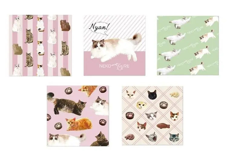ロフト限定の「ねこみゃみれ」雑貨は、古川紙工が手がける7種類のアイテムで構成され、合計で20種類が登場する。雑貨は紙製品を中心にした文具のラインが主体で、パッケージ柄や猫モチーフを活かしたデザインで統一されている。