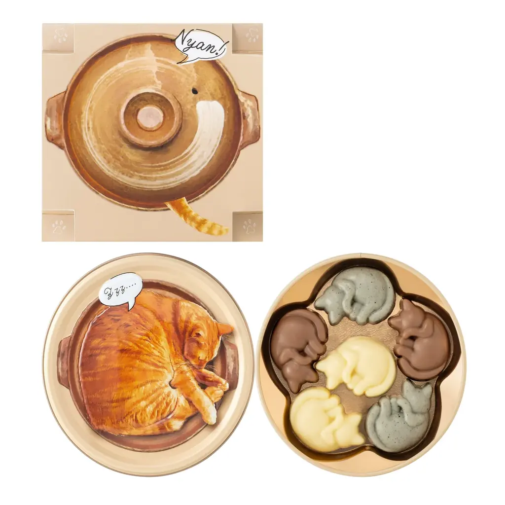 - 1,620円。4種類のチョコレート菓子を猫柄缶に詰め合わせた商品。