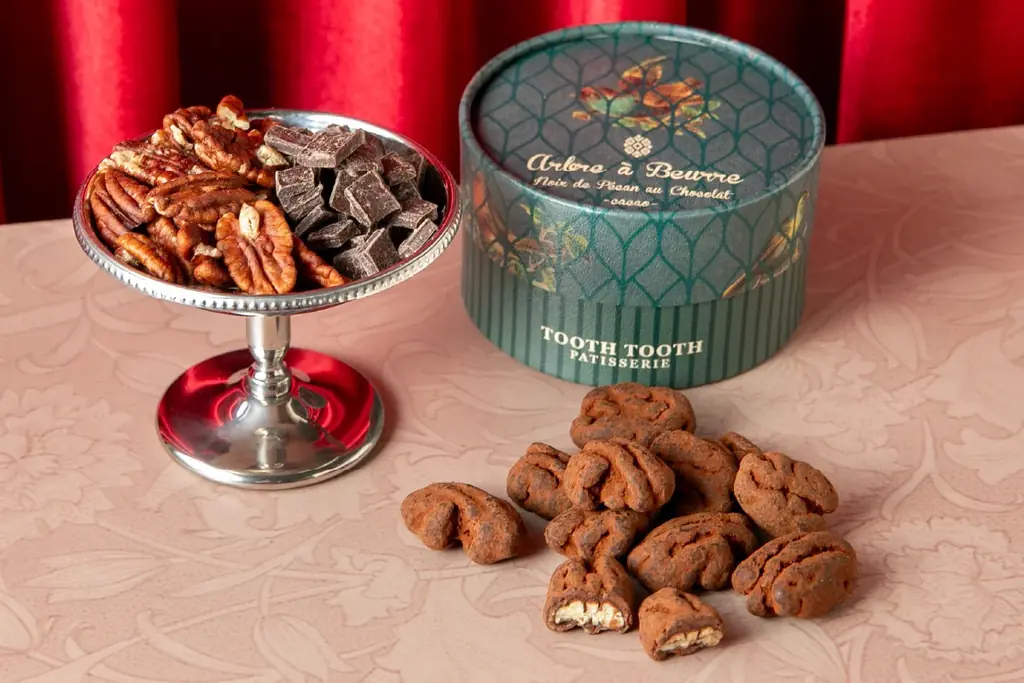 - ペカンナッツショコラ(ココア):1,080円(税込) — ローストしたペカンナッツをミルクチョコとココアパウダーで包んだ商品。