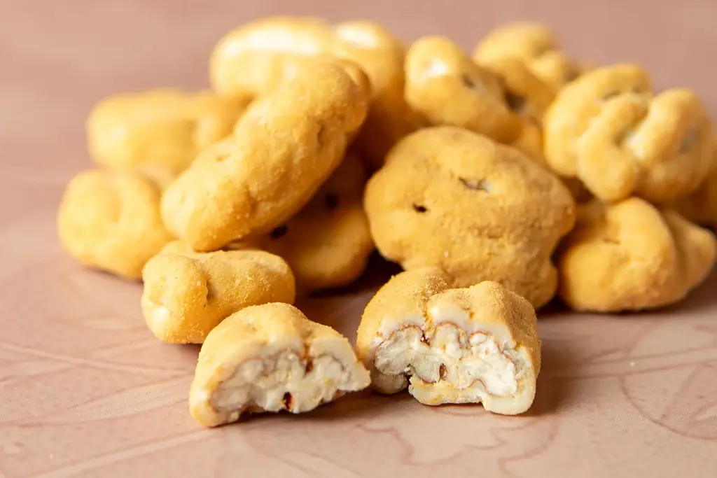 - ペカンナッツショコラ(キャラメル):1,080円(税込) — ローストペカンナッツをホワイトチョコとキャラメルパウダーで包んだ商品。