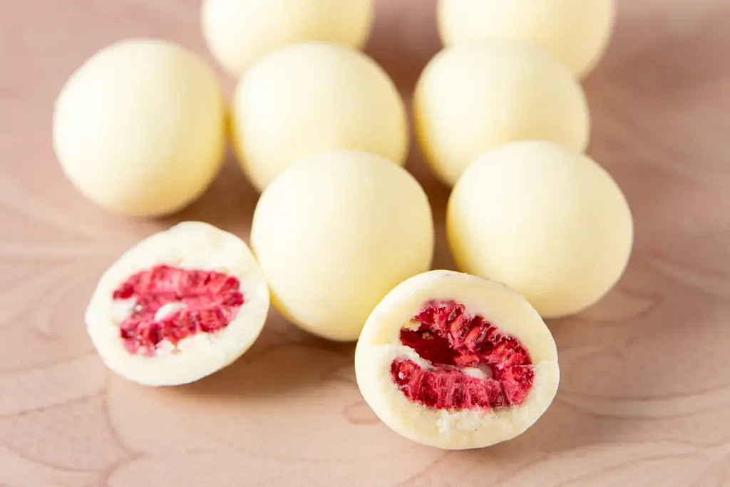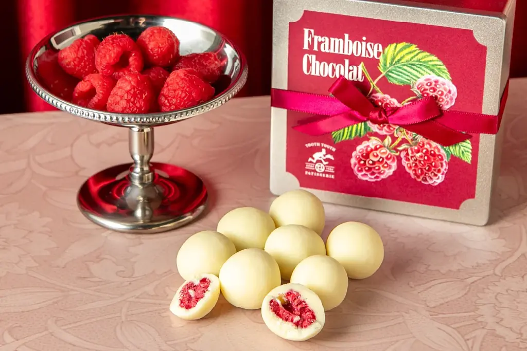 - フランボワーズショコラ:1,601円(税込) — 甘酸っぱいフランボワーズを丸ごとホワイトチョコで包んだ一粒菓子。