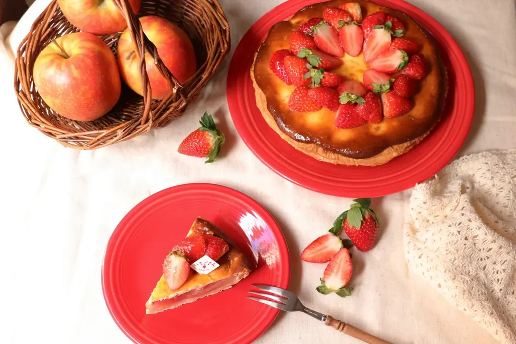 合わせるクリームは、いちご風味の自家製ミルククリームに練乳を加え、やさしいコクといちごの甘酸っぱさが一体になるよう調整されています。さらに、りんごの上にはなめらかなマスカルポーネチーズの生地をのせ、口どけの良い軽やかな食感をプラスしています。仕上げにはフレッシュな佐賀県産“いちごさん”を贅沢にトッピングしています。