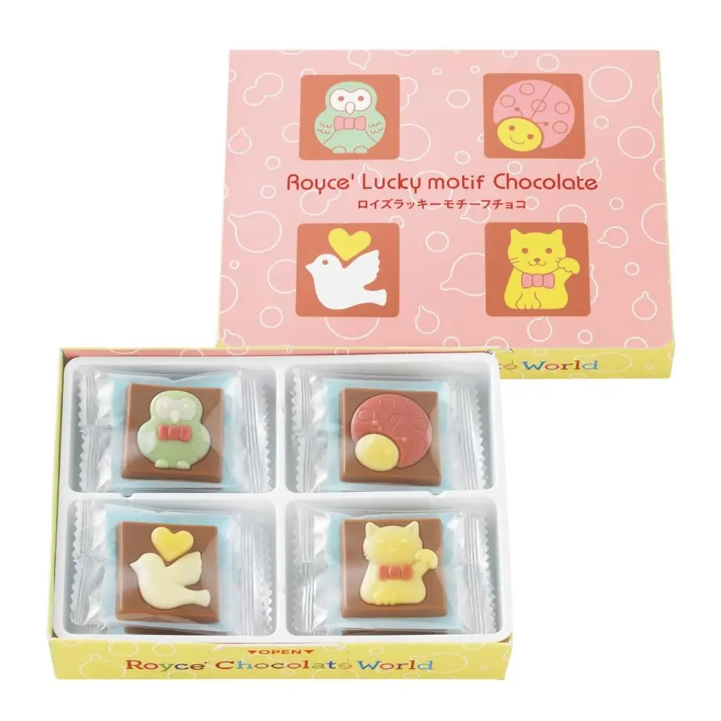 | ロイズラッキーモチーフチョコ | 12枚 | 648円(本体600円) | 通信販売:ご注文期間~2026年4月12日 | お届け希望日~2026年4月16日 | 新千歳空港『ロイズ チョコレートワールド』で通年販売。オンラインは期間限定。フクロウ・てんとうむし・ハト・招き猫の4デザイン。 |