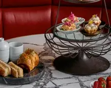 - セイボリー(アフタヌーンティー): ロブスターロール(ブリオッシュ、ポーチドロブスター、わさびマヨネーズ、いくら)、イベリコハムとトリュフのトースティ(ゴーダチーズ、ディジョンマスタード)、ワタリガニのサラダ(柚子、紫蘇、タピオカクラッカー)、かぼちゃのヴルーテ(V)(スパイス香るココナッツフォーム)、カリフラワームースのタルトレット(V)(キャラメリゼしたリーキ、オリーブオイルキャビア、チェダークラスト)