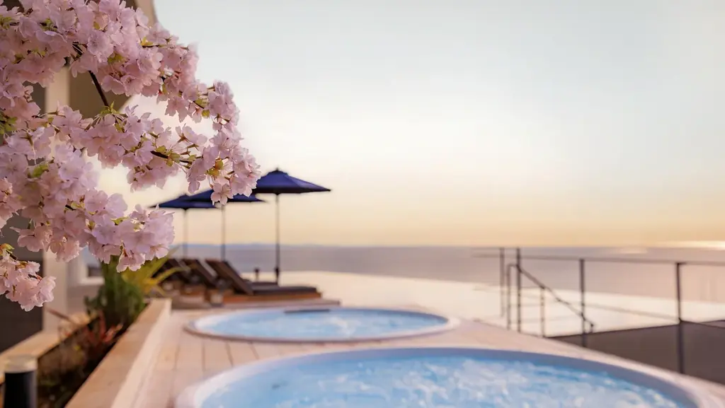 屋外テラスには本物の樹木の枝ぶりや質感を再現したアーティフィシャルフラワーを配置し、刻々と変わる空の色や海面の表情と桜アートが重なる幻想的な風景を創出します。インフィニティープールに入りながら視線の先に桜を望むことができ、屋外テラスでの滞在は従来のスパ体験に視覚的な楽しみが加わります。