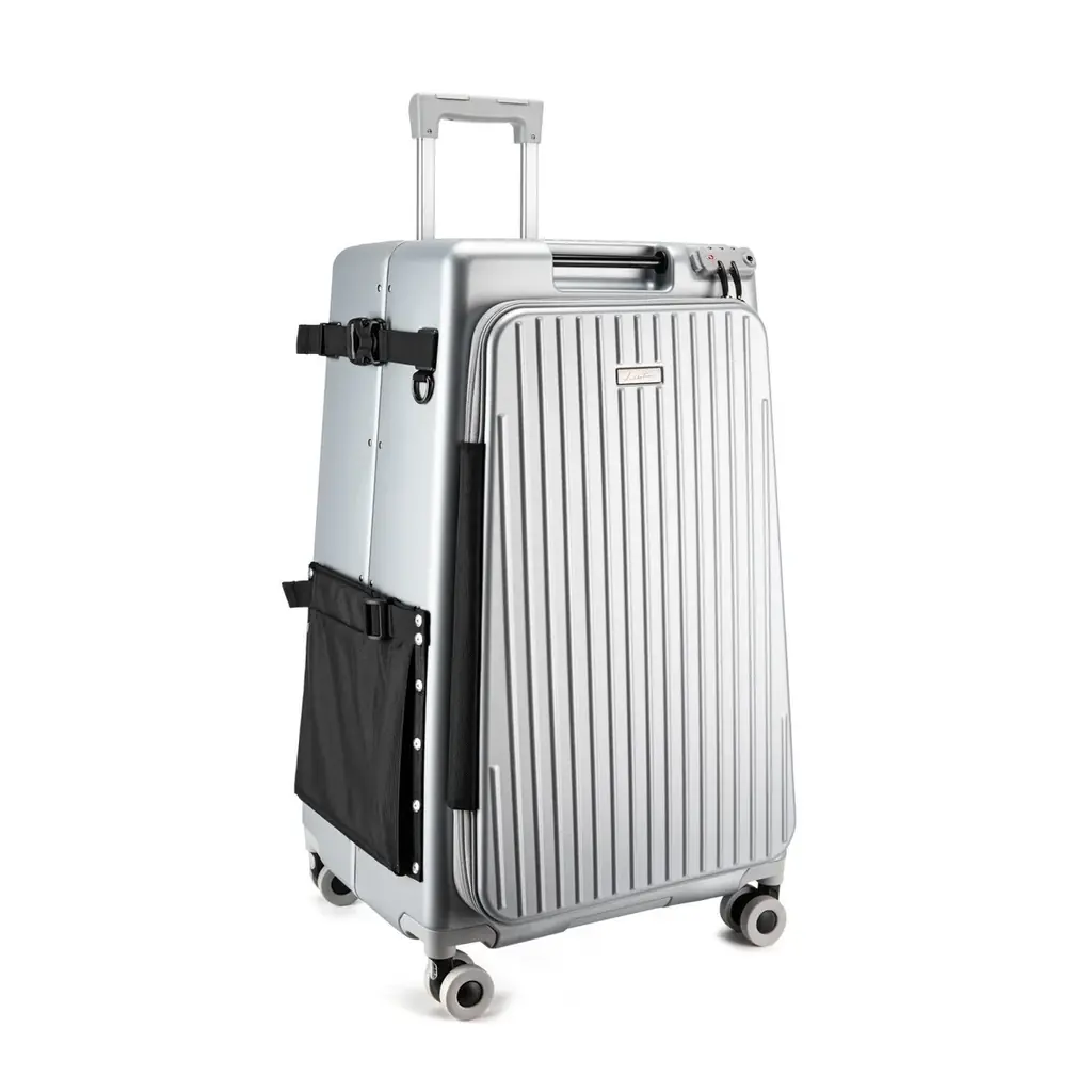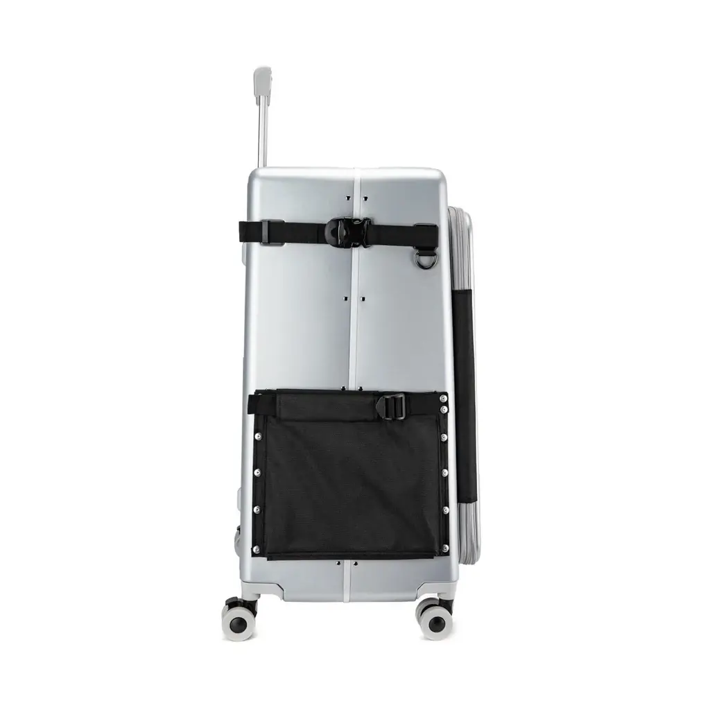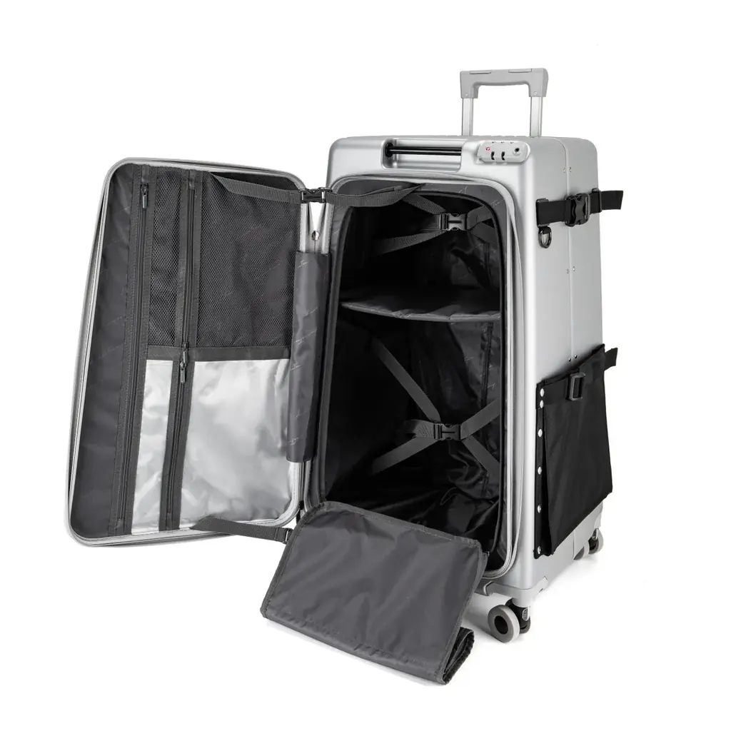 本体素材には高強度ポリカーボネートを使用し、外周にはアルミフレームを採用することで剛性と耐衝撃性を高めています。これにより、空港での預け入れや長距離移動における取り扱いを想定した高耐久設計としています。