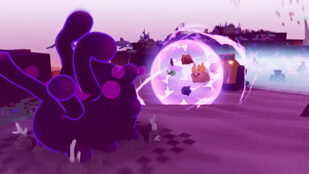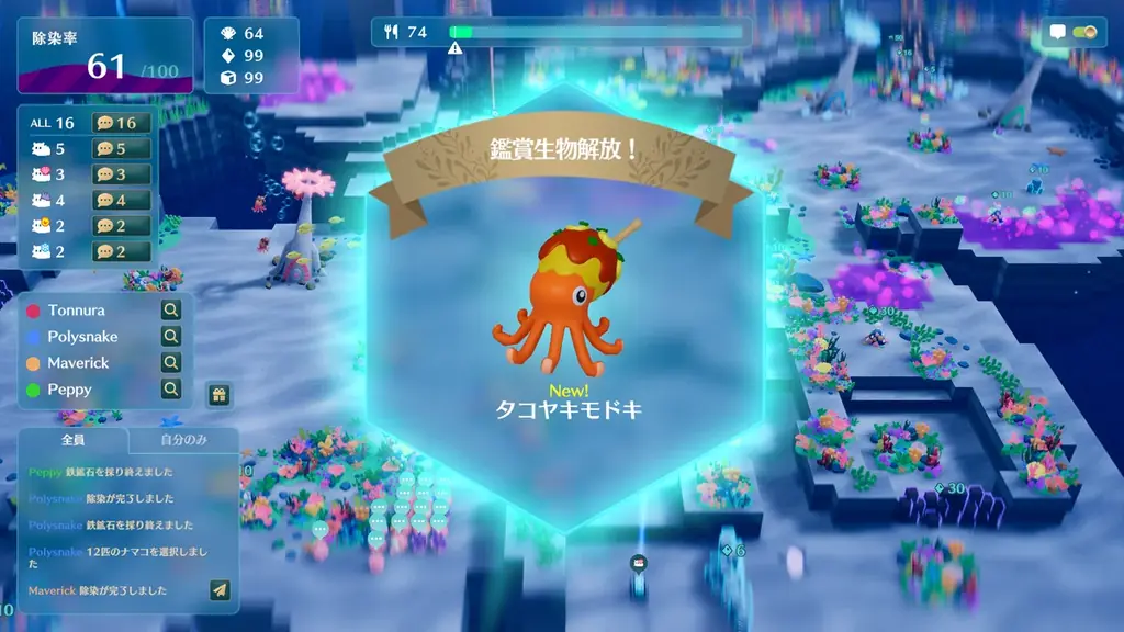 作中には「オケガレ様」と呼ばれる敵性の存在が出現します。除染中に出現するオケガレ様は汚染を体内に溜め込み、食料を腐食させ海を暗くしてしまいます。仲間と協力して『合体ナマコキャノン』で撃退する必要があります。また、画面右下にいる「ナビイルカ」がプレイ中のお役立ち情報を表示します。不要であれば非表示にもできます。