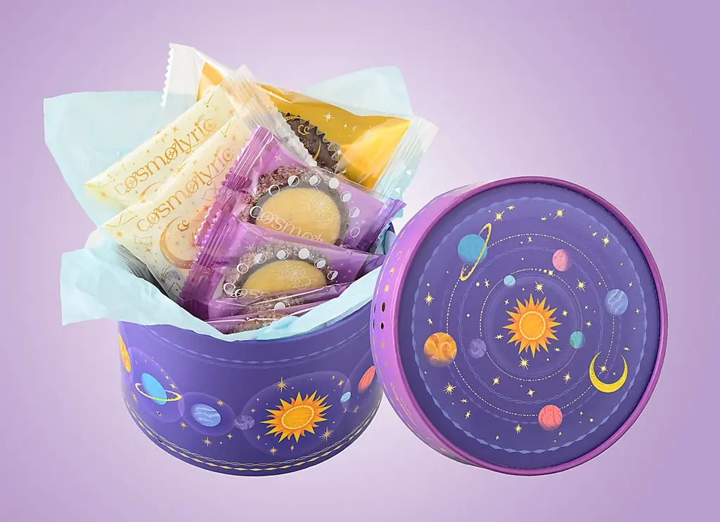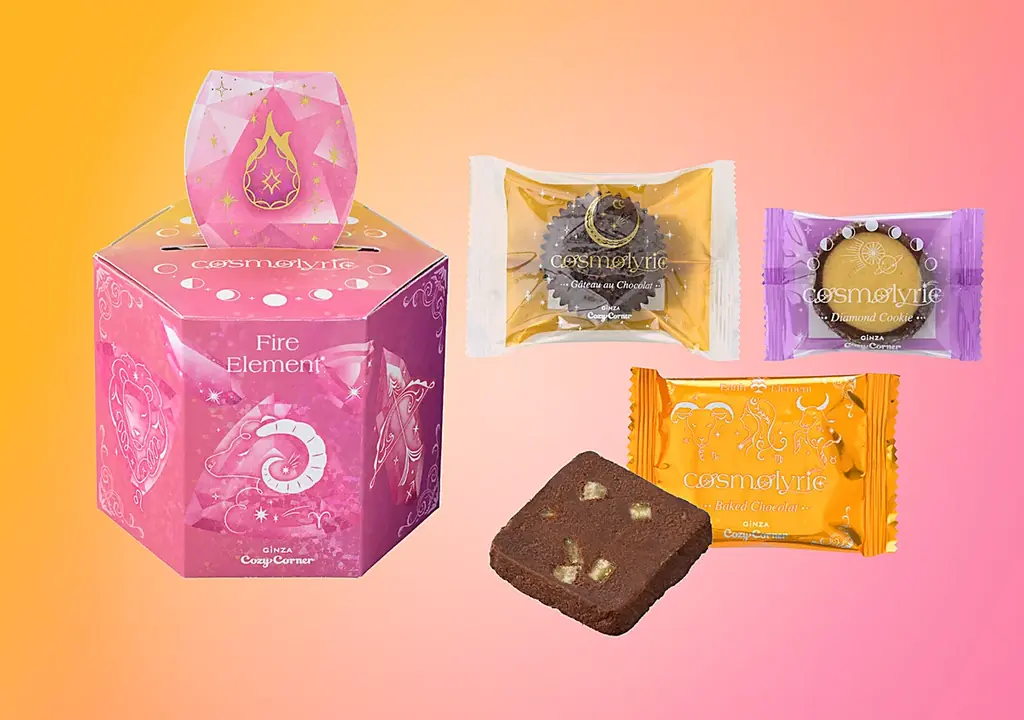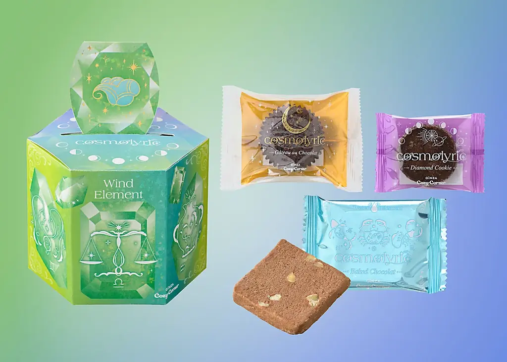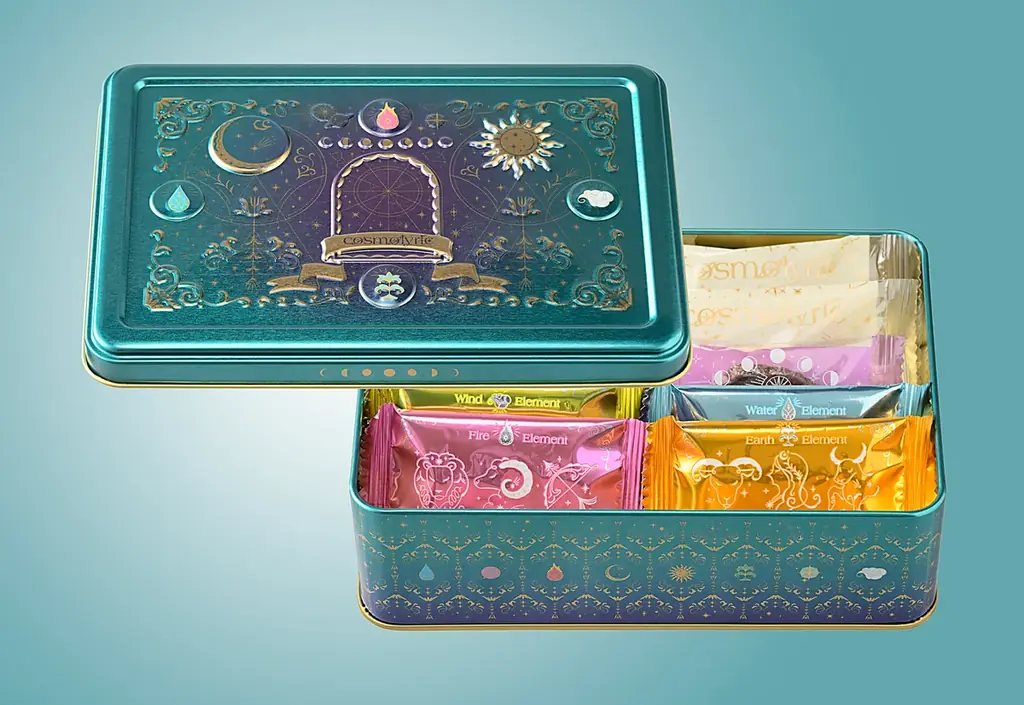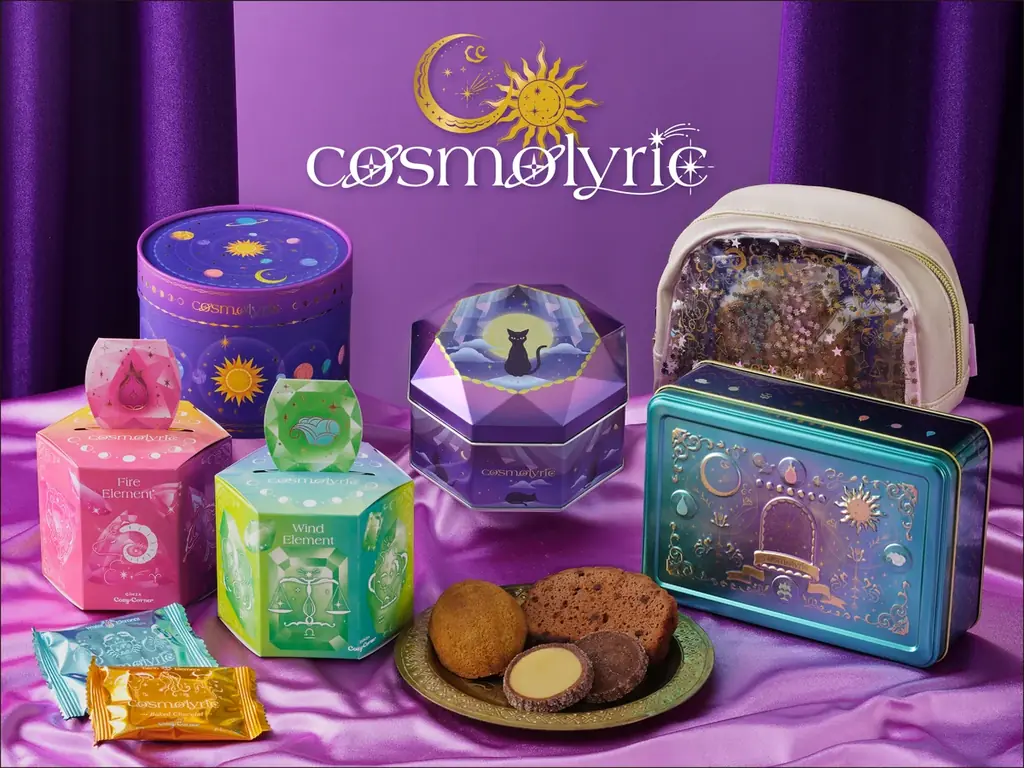 2026年のコスモリリックは、12星座を性質別に分けた四つのエレメント(火・地・風・水)をモチーフにした新作を追加しました。星座にまつわる象徴やストーンをあしらったパッケージデザインと、ラッキーモチーフの月や星をテーマにした焼菓子の組み合わせが特徴です。