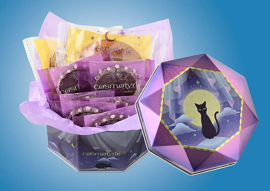- 特長:エレメントと星座、月と太陽、星の軌道などのデザインを施した缶に焼菓子4種をアソート。メッセージカード付き。