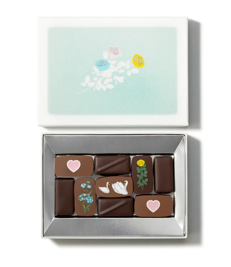 | お花のチョコレート | 9個入り。ハートやお花をプリントしたチョコレートやシンプルにデコレーションしたチョコレート、シトラスカモミール、ミックスベリーローズ、キャラメルなど6種類。ローズやカモミール、ベリーの香りを詰め合わせ。 | 3,564円 |