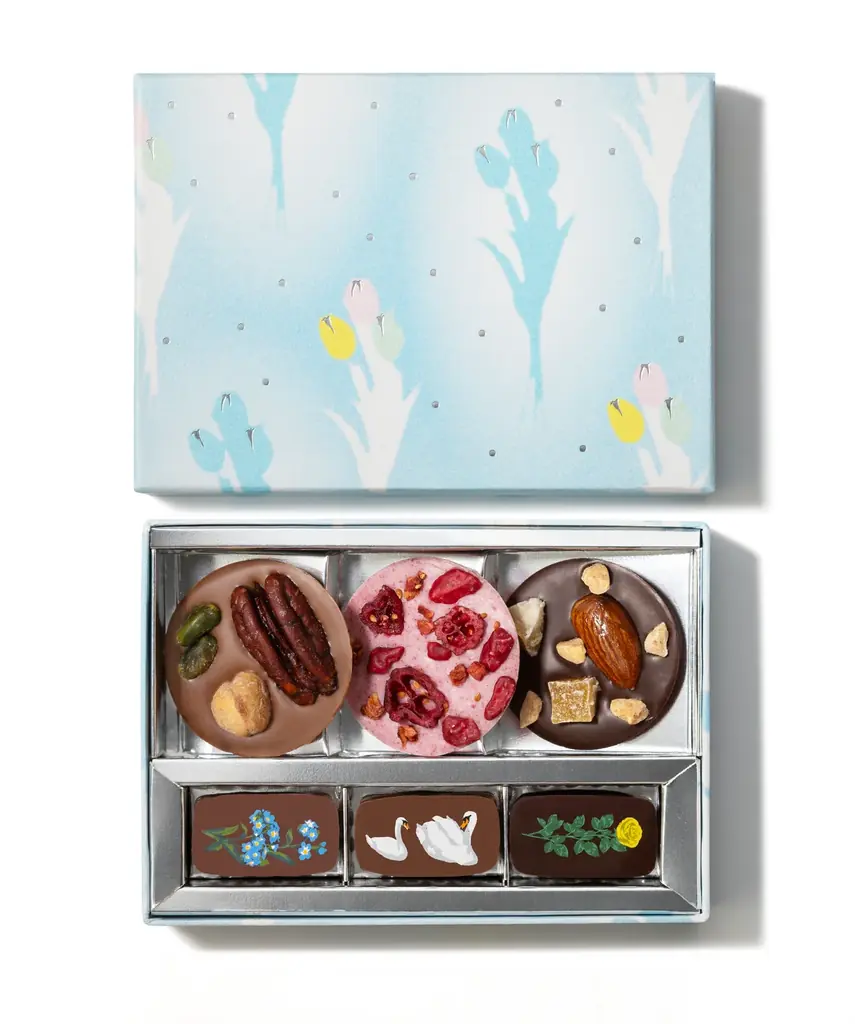 | 季節限定(朝露) | お花のチョコレート/マンディアンとお花のチョコレート/ペカンナッツのチョコレート/ミルクのトリュフ | 淡い色調と銀色の滴で朝露を表現。香りや素材のバランスに配慮した詰め合わせ。 | 3,564円/2,376円/2,160円/2,484円(各商品ごと) | 先行発売中店舗および2026年1月9日〜2月6日の順次開始店舗 |