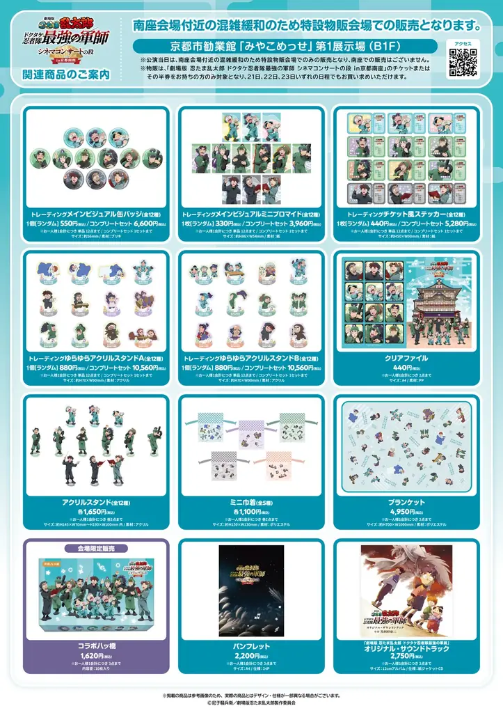 公演会場は京都 南座(京都市東山区四条大橋東詰)。会場付近の混雑緩和のため、グッズ販売は南座会場での実施は行わず、別途特設物販会場でのみ実施します。物販会場は京都市勧業館「みやこめっせ」第1展示場(B1F)です(〒606-8343 京都市左京区岡崎成勝寺町9-1)。