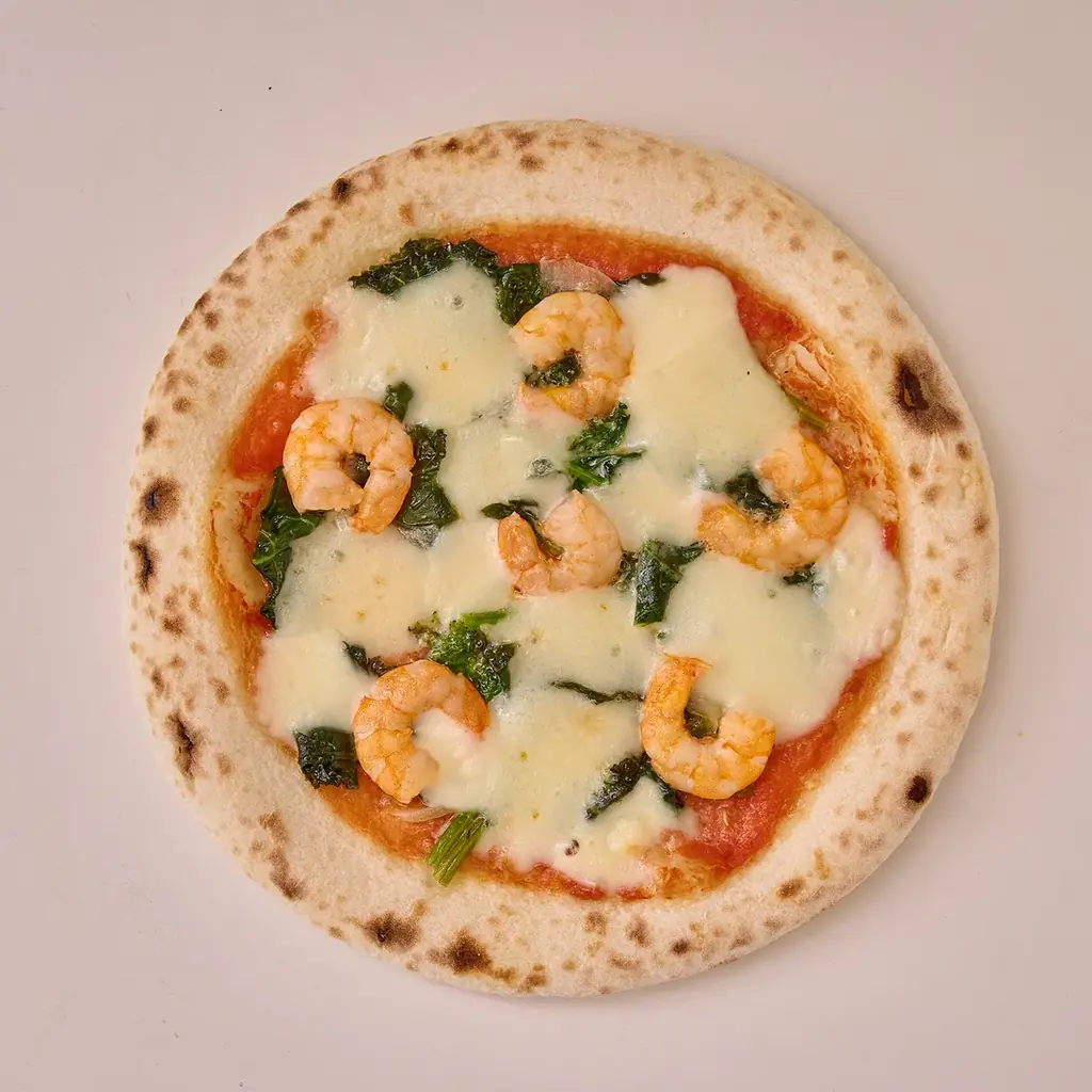 きらきらベジの人気商品である「サラダケール」を贅沢に1袋(50g)使用。旨味のあるエビとトマトベースのソースを組み合わせ、ケールの食感と風味を活かした一枚に仕上げています。