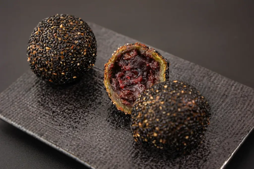 漆黒の新作を含む、三種の胡麻団子を一度に味わう提案