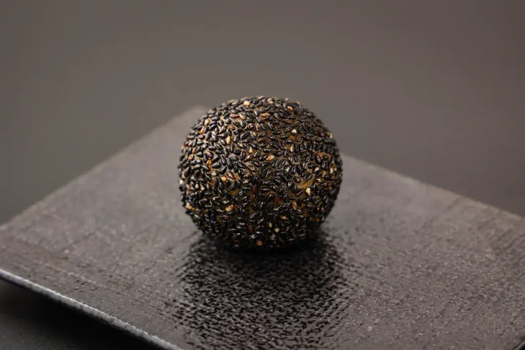 黒胡麻団子の餡は自家製レーズン餡で、ラム酒と紹興酒を用いて香りと深みを出しています。皮にはよもぎを練り込み、黒胡麻で覆うことで見た目と香りの両面で統一感を図っています。