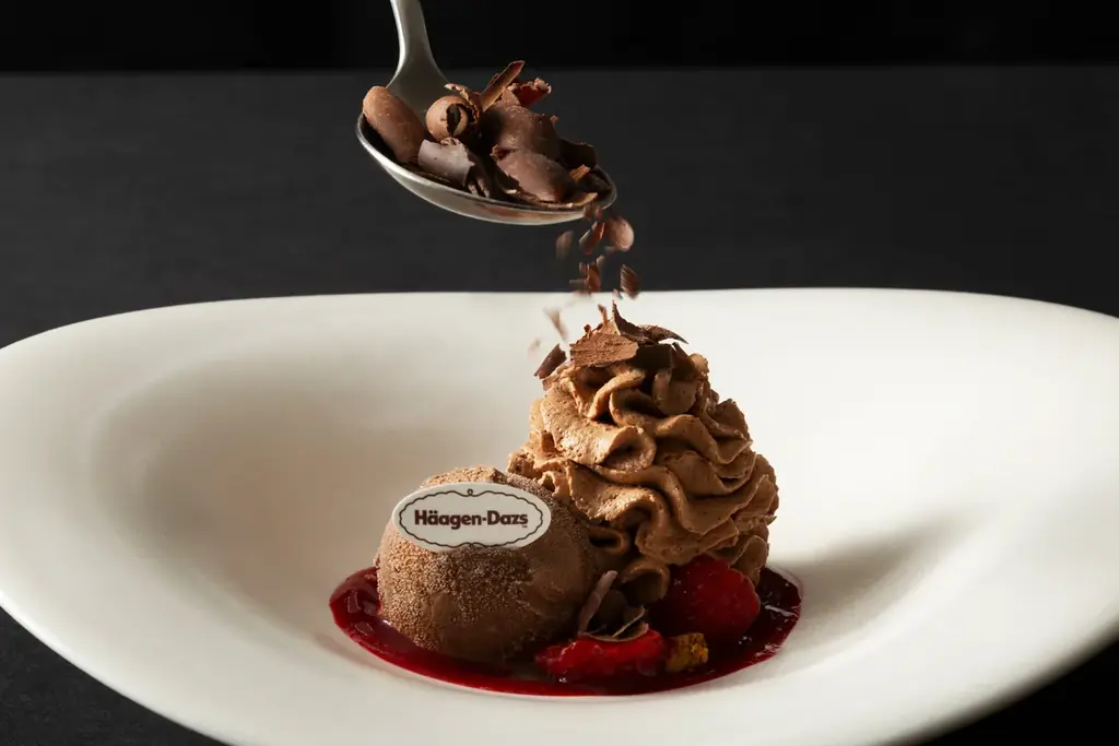 2月のテーマはショコラで、バレンタインシーズンに合わせた構成です。ライブクッキングの実演メニューは「ムース・オ・ショコラ with ハーゲンダッツ」で、深い味わいのチョコレートムースに甘酸っぱい木苺のソースを合わせ、ハーゲンダッツのミルクチョコレートアイスクリームを添えて、最後にカカオニブと削ったチョコレートを散りばめる仕上げが行われます。