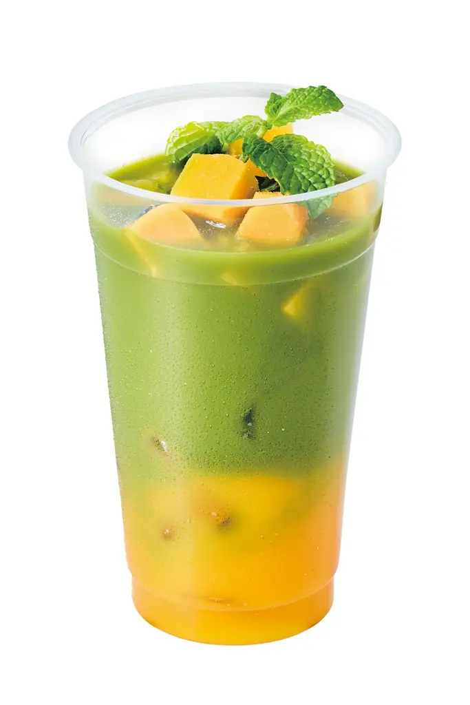 「抹茶×マンゴー」という一見意外な組み合わせを採用したドリンクです。深緑の抹茶とトロピカルな黄色のマンゴーが層や混ざりで表情を変え、一口ごとに変化する味わいが特徴です。