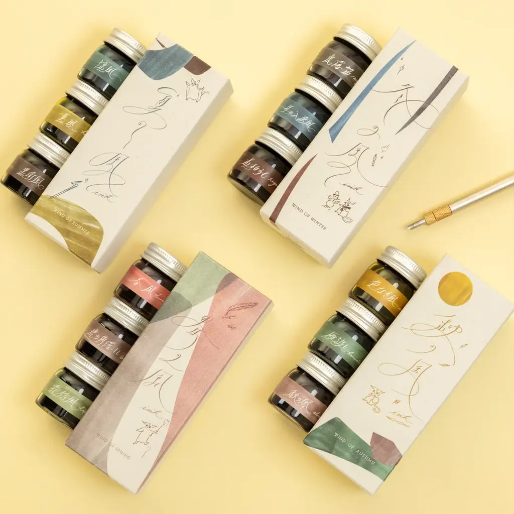 - 真鍮製の高級感あるつけペン本体と、別売りで四季をテーマにした3色のインクセット(例として「春の風」等)を組み合わせて楽しめる商品。