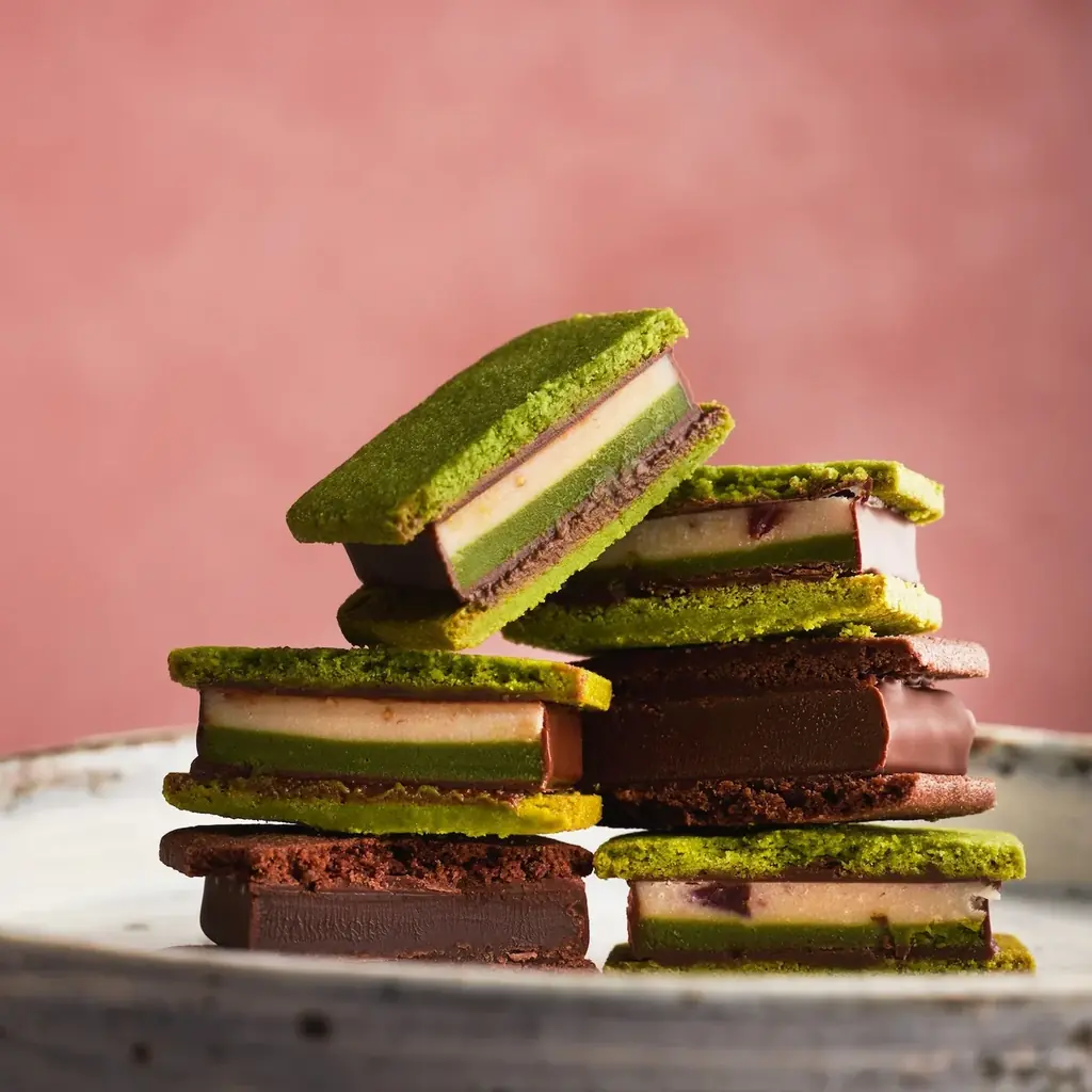 クッキー生地については、今回のコラボで初めて宇治抹茶をふんだんに使用する試みを行っています。1枚1枚を丁寧に焼き上げ、焼き色を細かく見極めたうえで選定する製造工程が採られており、抹茶とチョコレートのマリアージュが楽しめるバランスを追求しています。