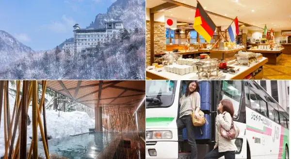 | 宿泊プラン特典 | 氷瀑まつり入場チケット、使い切りカイロ、夕食時60分トルネードビール飲み放題、朝陽リゾートホテルは貸切風呂 |