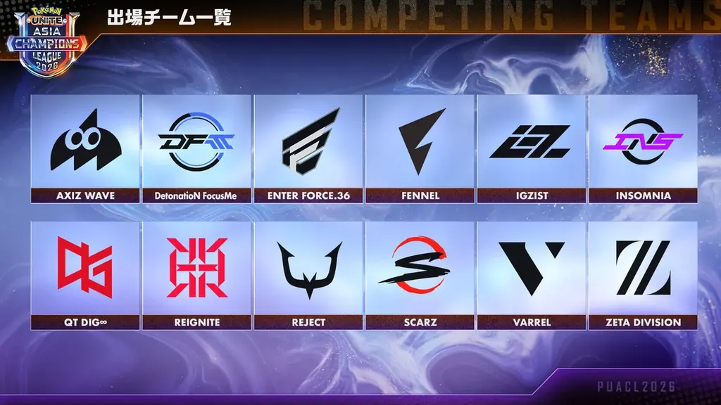 PUACL2026は2026年9月開催予定の『第20回アジア競技大会(愛知・名古屋)』におけるポケモンユナイト競技の日本代表選考にとって重要な参考大会に位置づけられています。日本代表候補の選手はポジション別にリストアップされ、大会でのパフォーマンスや親善試合の結果などを総合的に評価して、3月までに最終的な代表候補を決定する予定です。
