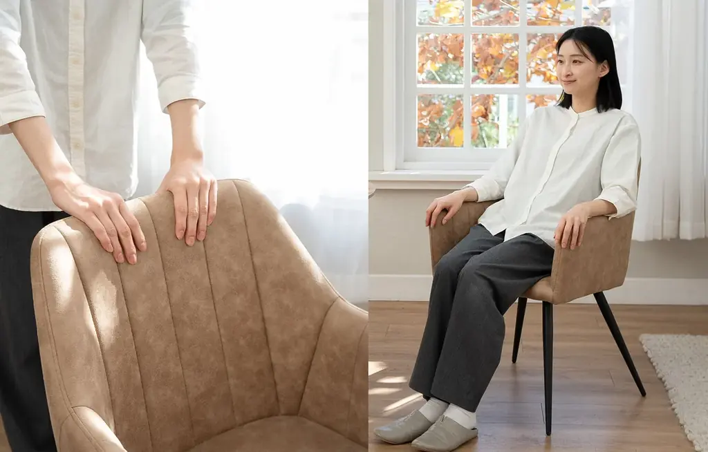 ライン仕上げの脚は力強さを与えつつも、木目調の表情により全体に柔らかな印象を添えています。結果として、家庭のリビング・ダイニングはもちろん、対話や協働を重視するオフィスや、落ち着いた空間を求めるカフェでの使用まで対応可能です。