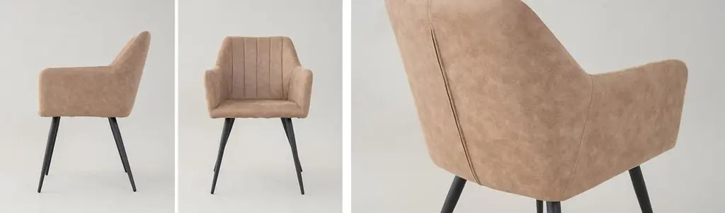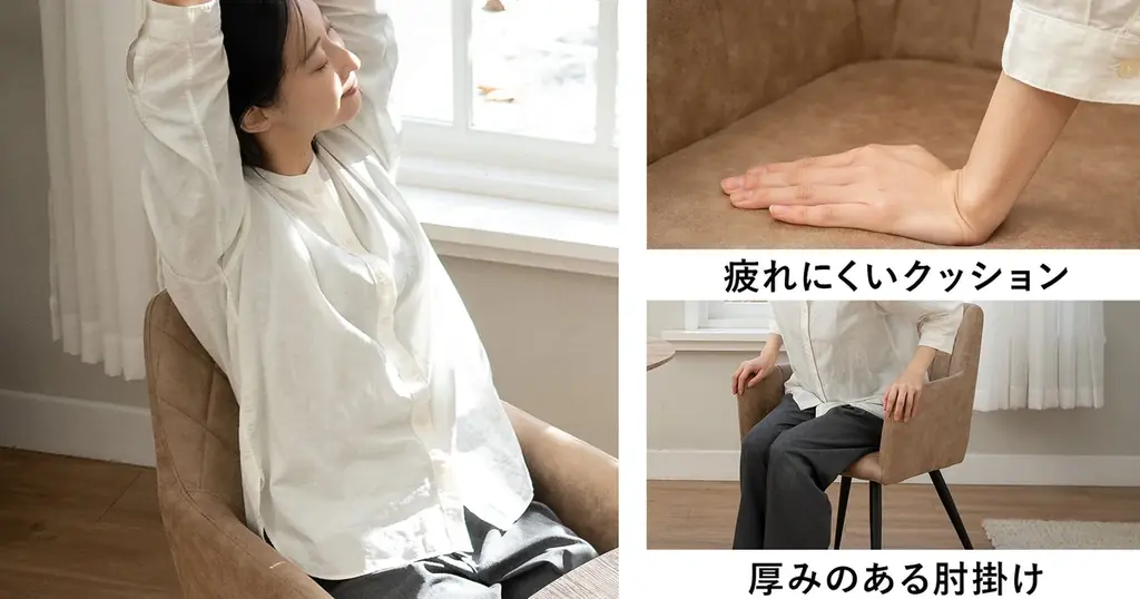 チェアは本革の風合いを再現したファブレザー張地と細身で頑丈なスチール脚を組み合わせた仕様です。厚みのある肘掛けと緩やかな背もたれのカーブは、包み込まれるような座り心地を実現しています。ウレタンの適度な硬さにより長時間の使用でも疲れにくい設計です。