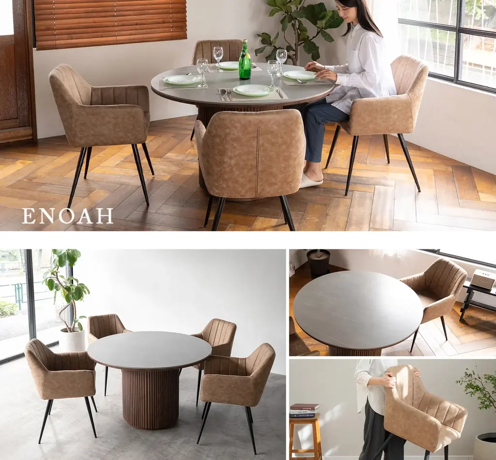 ここまでの内容を整理すると、ENOAH(エノア)はセラミック天板と木目調シングルレッグを組み合わせたラウンドダイニングテーブルで、2026年1月12日より予約販売が開始され、1月下旬入荷予定の製品です。テーブル単品と4脚セットの2種類を用意し、用途は家庭、オフィス、カフェなど多岐に渡ります。
