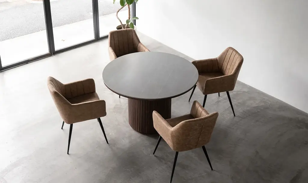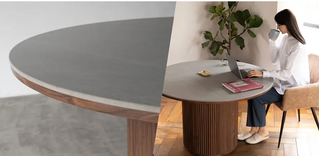 セラミック天板と木目シングルレッグが織りなす、新しいラウンドダイニングの提案